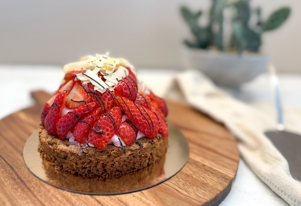 Klassisk tærte med hindbærskum, friske jordbær og sprød bund.